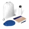Composto por mochila sacola branca em Nylon 190D com alças ajustáveis; garrafa em alumínio branco com tampa plástica rosqueável preta com alça; mouse pad azul ergonômico com apoio de espuma para o punho; caderno para anotações wire-o com capa dura bege/azul e caneta esferográfica em ABS azul.