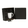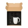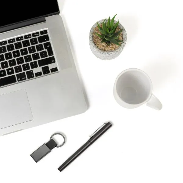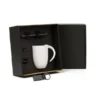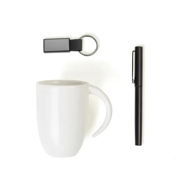 Composto por caneca em cerâmica branca com capacidade de 350 ml; caneta roller em alumínio com tampa preta e chaveiro na cor Ônix em Metal/PU.