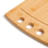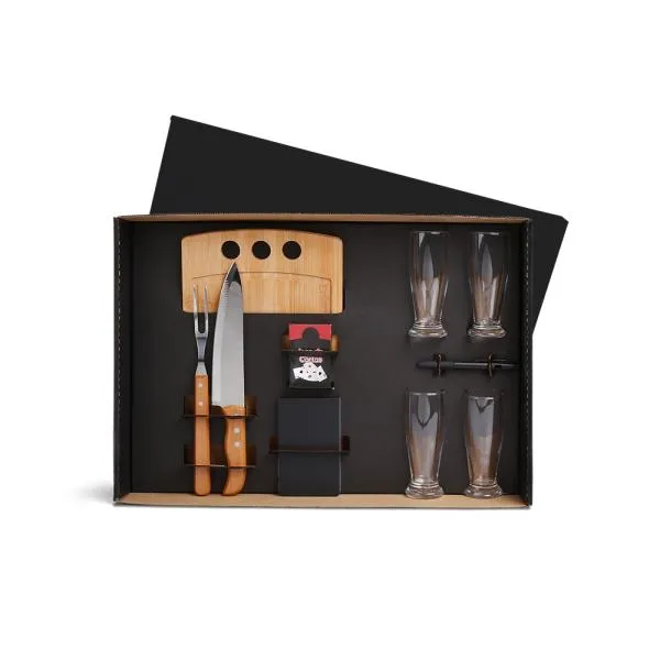 Kit para Churrasco, Cerveja e Truco. Composto por tábua com três furos em Bambu; garfo trinchante e faca 8″ em Madeira/Inox; quatro copos de cerveja em vidro; bloco de anotações; caneta esferográfica e jogo de cartas.