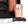 Kit churrasco com garrafa, canivete e bainha. Composto por tábua para churrasco/cozinha em bambu; faca 7″ para cozinha e garfo em madeira/inox; garrafa em aço Inox com pintura amadeirada, canivete confeccionado em aço inox com cabo emborrachado e bainha em couro.