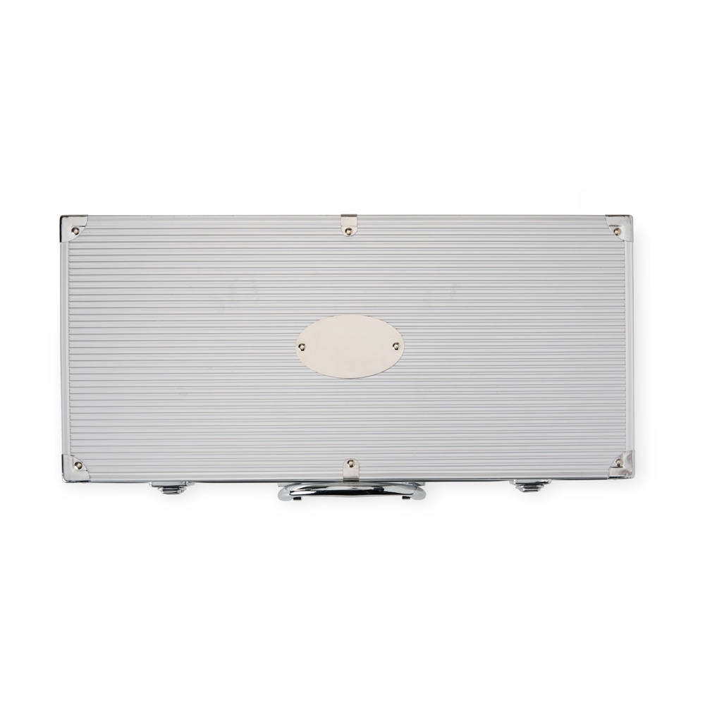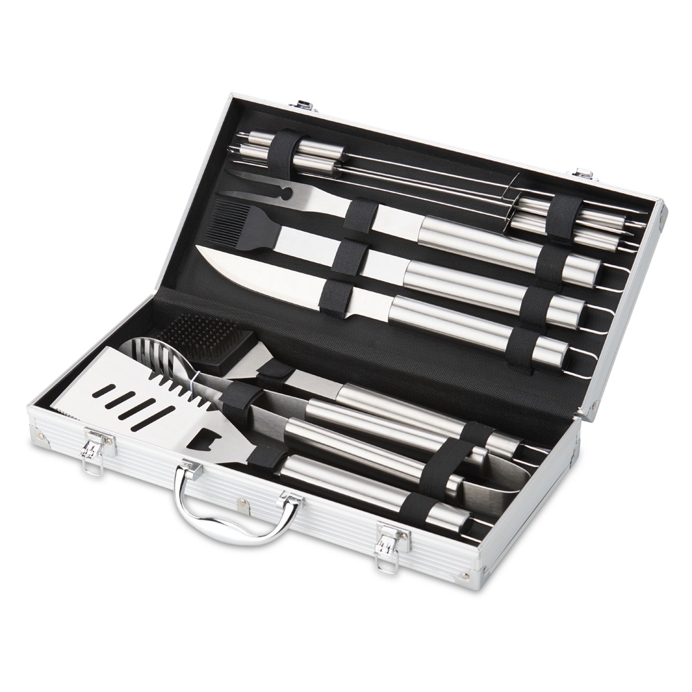 Kit churrasco 10 peças em maleta de alumínio com travas de segurança e placa central para personalização. Contém: espátula, pegador, escova para grelha, faca, pincel, garfo e quatro espetos, parte interna da maleta com revestimento em TNT e suportes de velcro para fixação das peças.