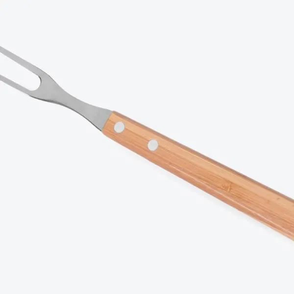 Conjunto composto por chaira em Bambu/Inox; faca 8″ e garfo trinchante em Madeira/Inox.