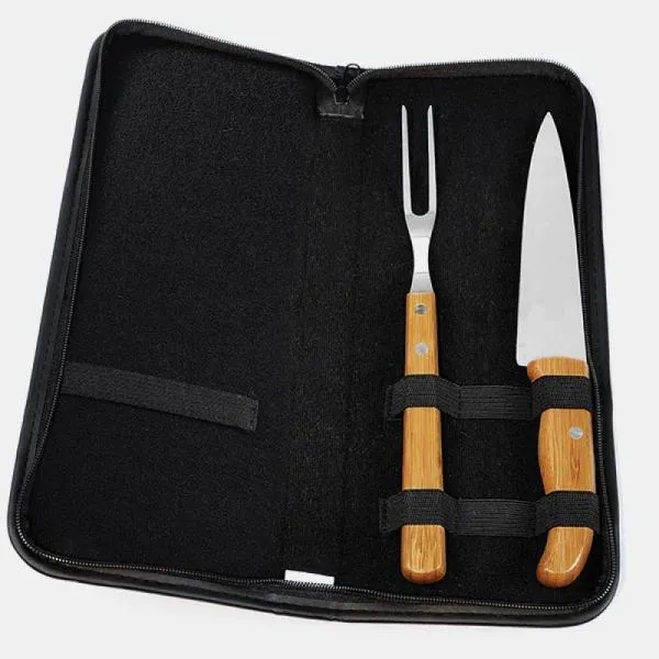 Kit com um avental confeccionado em Brim preto com bolso frontal, tiras na cintura e pescoço com regulagem de altura, uma faca 7” em Bambu/Inox e garfo trinchante em Madeira/Inox.