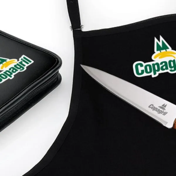Gravação: Uma gravação em Silk-Screen no estojo e no avental e uma a Laser na lâmina da faca 7″.