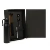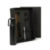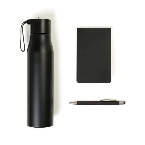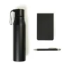 Composto por garrafa em alumínio reciclado na cor preta; bloco para anotações preto e caneta esferográfica em alumínio preto.