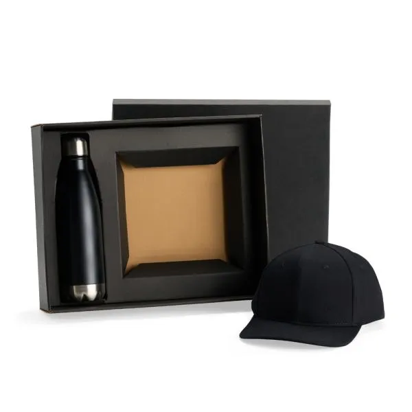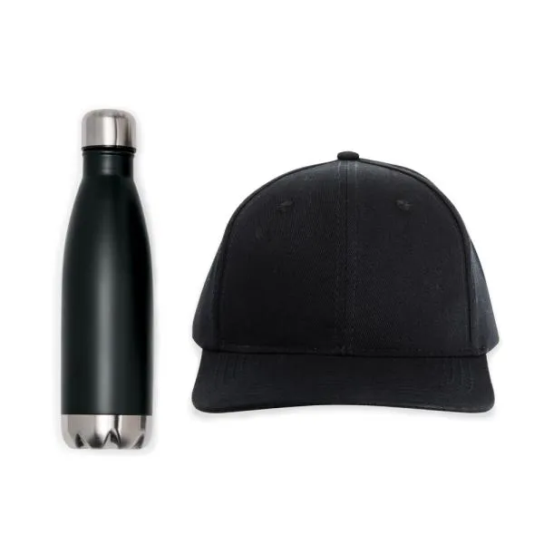 Composto por garrafa em Aço Inox preta com tampa rosqueável e boné na cor preta.