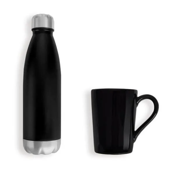 Kit garrafa e caneca. Composto por garrafa em aço inox preta com tampa rosqueável e caneca em cerâmica preta.