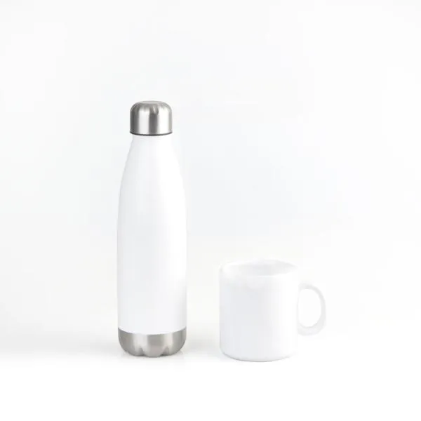 Kit garrafa e caneca. Conta com garrafa em aço inox branca com tampa rosqueável e caneca em cerâmica branca.