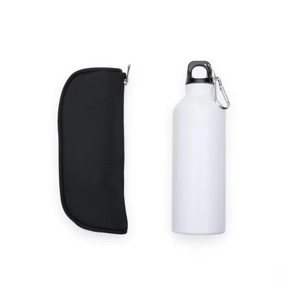 Composto por squeeze branca em alumínio revestido com verniz e necessaire confeccionada em microfibra preto, possui forro em nylon e zíper superior.