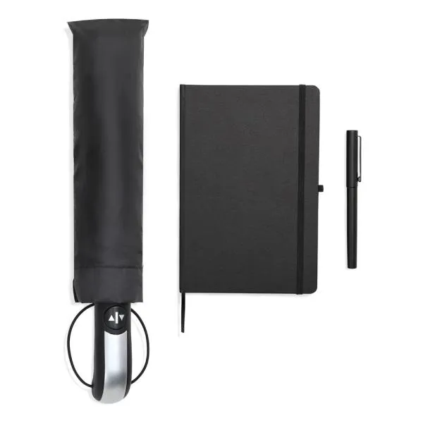 Kit guarda-chuva, caderno e caneta. Composto por guarda-chuva confeccionado em Nylon 190T na cor preta com ativação automática ao pressionar um botão, tanto para abrir quanto para fechar, empunhadura confortável com elástico para fixar no pulso, diminuindo o risco de queda e aumentando a segurança. Conta também com caderno para anotações preto com capa dura e caneta roller em alumínio com tampa preta.