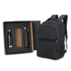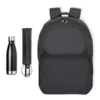 Kit mochila, guarda-chuva e garrafa. Composto por mochila preta confeccionada em Polyester 600D; guarda-chuva confeccionado em Nylon 190T na cor preta e garrafa em Aço Inox preta com tampa rosqueável.