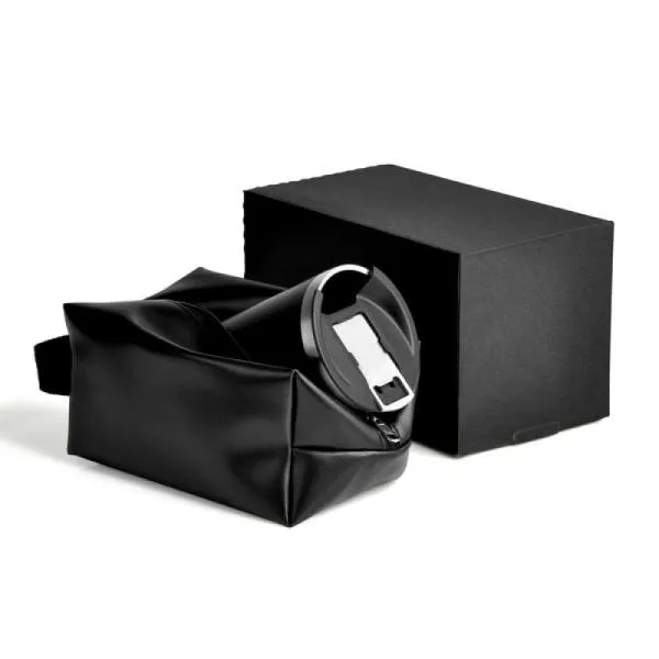 Kit necessaire e copo térmico. Composto por necessaire com alça em material sintético na cor preta e copo térmico com tampa e abridor de garrafa, confeccionado com dupla parede de inox, isolada a vácuo.