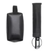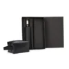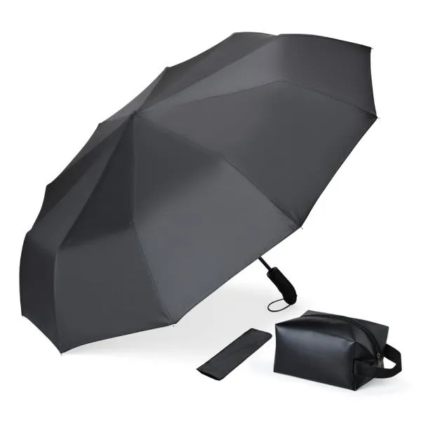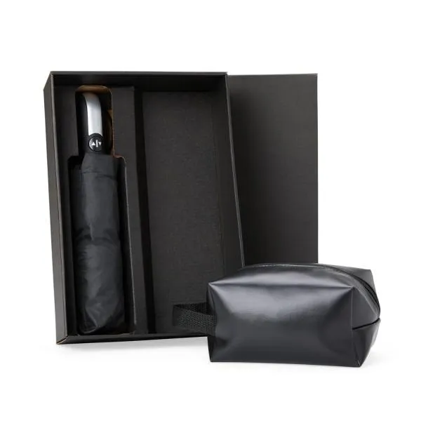 Kit necessaire e guarda-chuva. Composto por guarda-chuva confeccionado em Nylon 190T na cor preta com ativação automática ao pressionar um botão, tanto para abrir quanto para fechar, empunhadura confortável com elástico para fixar no pulso, diminuindo o risco de queda e aumentando a segurança; necessaire com alça em material sintético na cor preta.