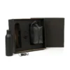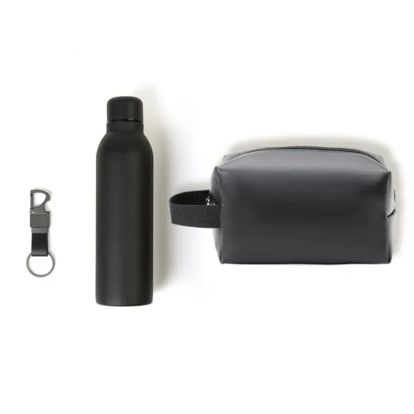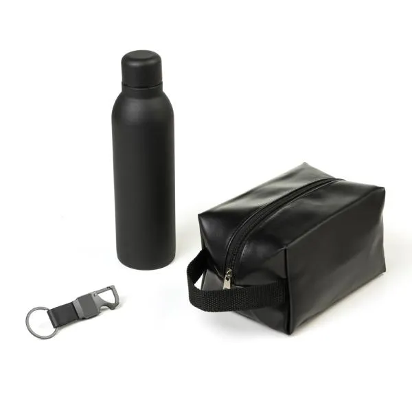Composto por garrafa preta em metal Inox, confeccionada com dupla parede em Inox; necessaire com alça em material sintético na cor preta e chaveiro confeccionado em metal e PU preto.