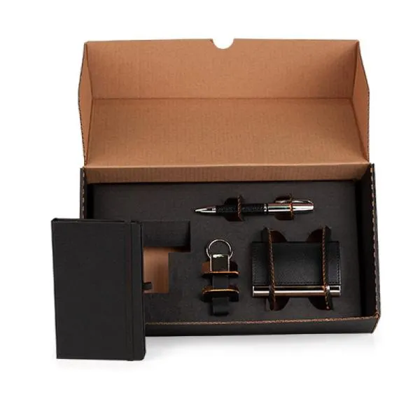 Kit office. Conta com uma caderneta de 80 folhas preto; Porta-cartão em material sintético preto texturizado e metal cromado para aproximadamente 20 cartões; Caneta esferográfica em metal com corpo revestido em material sintético preto texturizado e chaveiro em metal com material sintético preto.