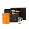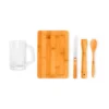 Composto por tábua retangular, amassador para caipirinha e colher de 18 cm em Bambu; faca 4″ para frutas em Madeira/Inox e caneca para cerveja/chopp em vidro.