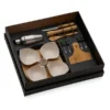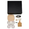 Composto por tábua, socador e colher em Bambu; petisqueira com base em Bambu e 5 potes; faca 4″ em Madeira/Inox; coqueteleira e 4 palitos em Inox.