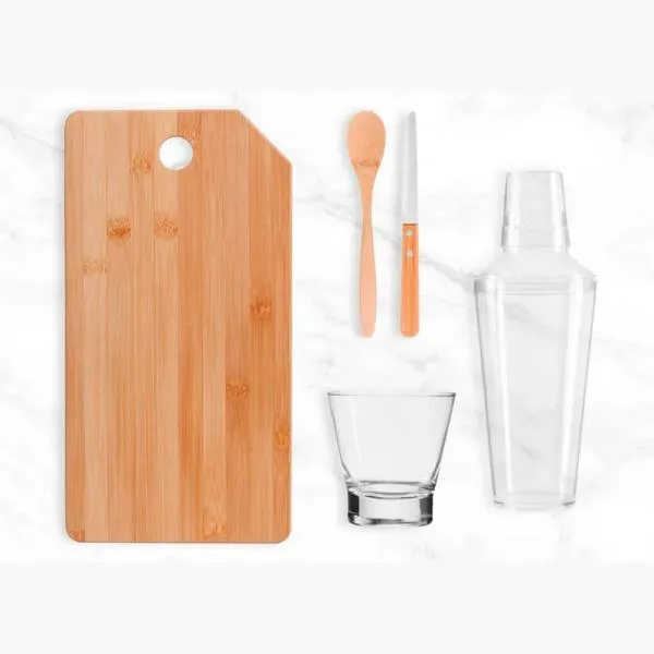 Kit para Caipirinha e Drink com coqueteleira em plástico PS; tábua e colher 18cm em Bambu; faca 4″ para frutas em Madeira/Inox; copo em vidro.