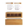 Composto por caixa para chás em Bambu/Poliestireno; duas colheres de 13 cm em Bambu e duas canecas de vidro com capacidade de 300 ml cada.