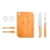Composto por tábua e duas espátulas de 14 cm em Bambu; dois ramekins em plástico; faca 7″ e garfo em Madeira/Inox.