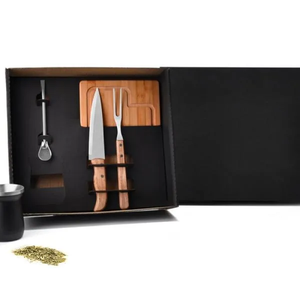 Conta com tábua em Bambu; Faca 7″ e garfo em aço Inox/Madeira; cuia em Aço Inox; bomba para chimarrão / tereré.