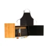 Composto por tábua para Churrasco em Bambu; faca 8″ e garfo trinchante premium em Madeira/Inox; pegador para Churrasco em Madeira/Inox e avental em Corvim marrom.