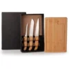 Conjunto para Churrasco. Composto por tábua em Bambu com sulco; faca 7”, faca 7″ para frios em Bambu/Inox. Acompanha também uma faca 5″ para desossar.