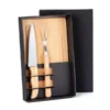Kit para Churrasco em Bambu/Inox. Acompanha tábua em Bambu de 32 cm com sulco; faca 7” em Bambu/Inox e garfo trinchante em Madeira/Inox.