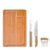 Kit para Churrasco. Composto por tábua em Bambu; garfo trinchante, faca 8″ e garfo de 5 dentes com abridor de garrafa em Madeira/Inox.
