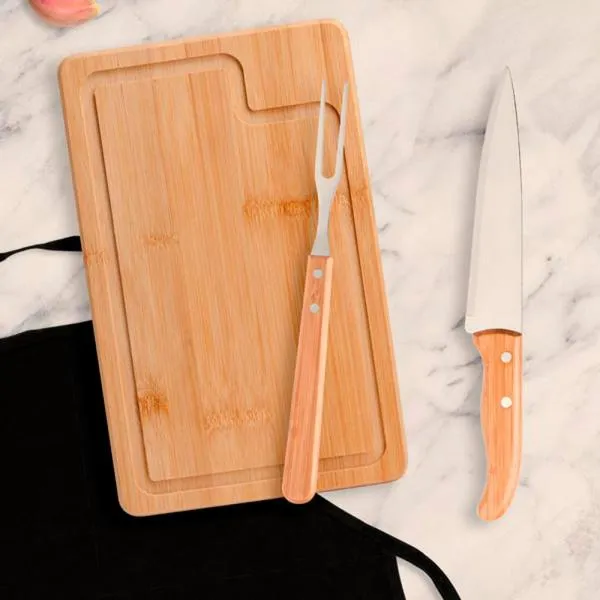 Acompanha avental em Brim; tábua em Bambu com sulco; faca 7” em Bambu/Inox e garfo trinchante em Madeira/Inox.