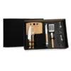 Kit para Churrasco/Hambúrguer/Cerveja. Composto por tábua em Bambu com três furos; garfo trinchante, faca 8″, pegador e espátula perfurada em Madeira/Inox; avental em Brim preto; dois ramekins em porcelana e duas taças para Cerveja em vidro.