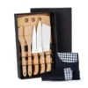 Kit para Cozinha. Composto por tábua com sulco, colher e espátula de 30 cm em Bambu; faca 7″ em Bambu/Inox; faca 8″ e cutelo 6″ em Madeixa/Inox. Acompanha também avental com bolso e bandana em Brim preto.