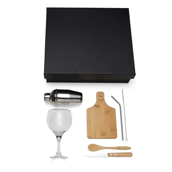 Kit composto por tábua e colher de 18 cm; faca 4″ em Madeira/Inox; coqueteleira, canudo e limpador em aço Inox. Acompanha também uma taça para gin em vidro.