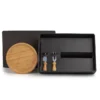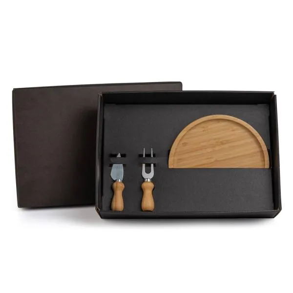 Composto por petisqueira redonda em Bambu; faca e garfo para Queijo em Madeira/Inox.