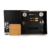 Conta com petisqueira e duas espátulas em bambu, dois ramekins em porcelana, duas taças para vinho em vidro; d abridor de vinho em metal.
