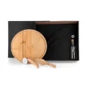 Conta com tábua redonda em tripla camada invertida e espátula em Bambu; cortador de Pizza em Madeira/Inox e garrafa de vidro para azeite 250ml.