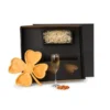 Kit para petisco e champanhe. Conta com petisqueira formato de trevo em bambu; Taça para champanhe em vidro; Espaço para garrafa com palha (NÃO ACOMPANHA GARRAFA).