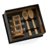 Conta com base, colher e colher perfurada de 30 cm em bambu; 6 potes de vidro com tampa;