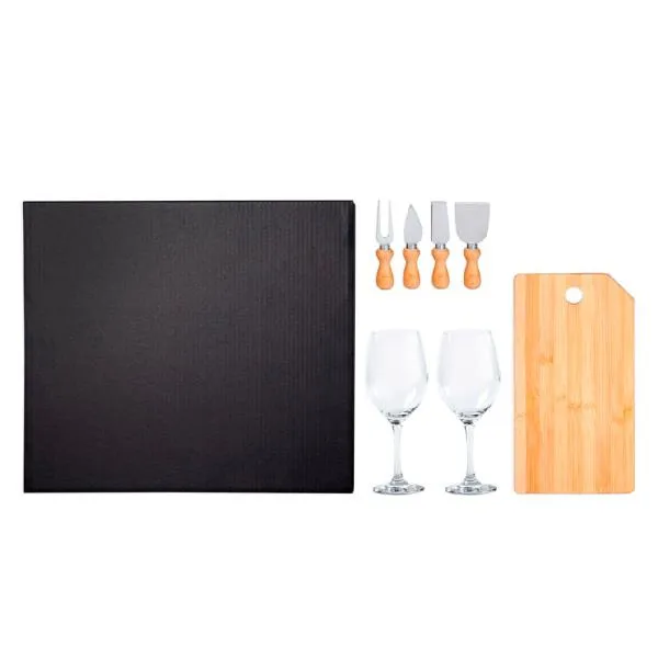 Kit Queijo e Vinho. Composto por tábua em Bambu; duas taças em vidro para Vinho; duas facas, sendo uma com ponta e outra reta, um garfo e uma espátula em Madeira/Inox.