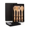 Confeccionado em Bambu com avental, colher, colher perfurada, espátula quadrada e espátula perfurada em Bambu e avental em Brim.