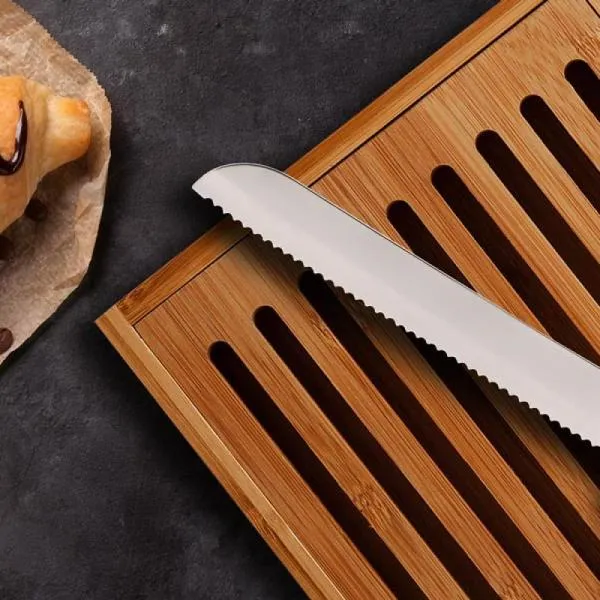 as migalhas e uma faca 7” para pão com cabo em bambu e lâmina em aço