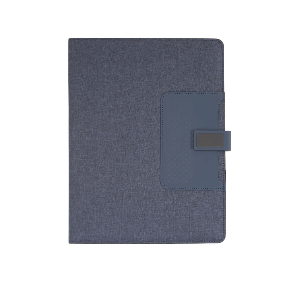 Pasta convenção com bloco para anotações. Pasta confeccionada em material sintético, possui fecho imantado com plaquinha emborrachada, ?bolso? interno para arquivar documentos, suporte para cartões, celulares e caneta, além de um bloco com folhas brancas pautadas de aproximadamente 22 folhas.