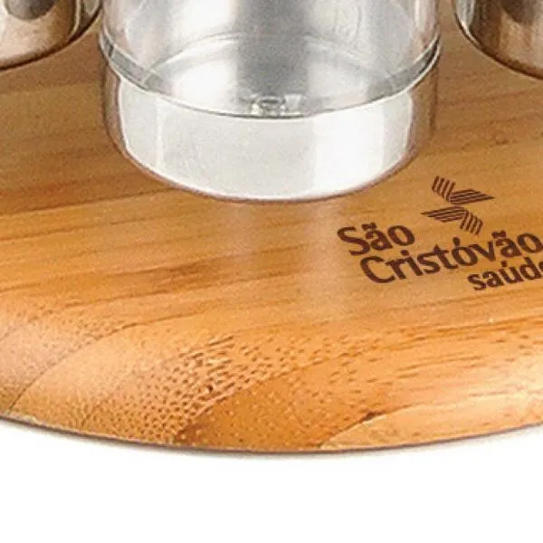 Acompanha base em Bambu/Inox e 5 porta condimentos em Acrílico com tampa e fundo em Inox.