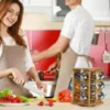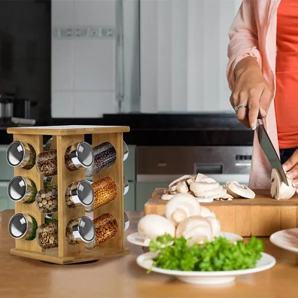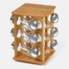 Acompanha base giratória em Bambu e 12 porta condimentos em Vidro com tampa.