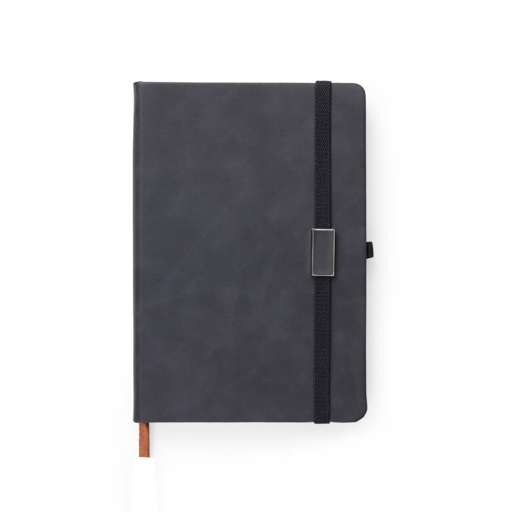 Caderneta emborrachada com suporte para caneta. Contém aproximadamente 96 folhas amarelas com pauta, suporte de nylon para caneta (não acompanha), marcador de página em cetim e elástico para lacre com plaquinha de centro emborrachado.