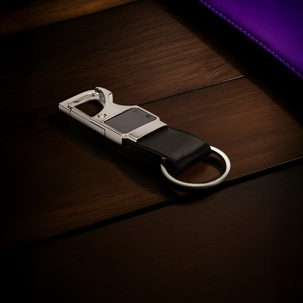 Chaveiro em metal com tira em couro sintético. Possui mosquetão e pode ser utilizado como um abridor de garrafas.
