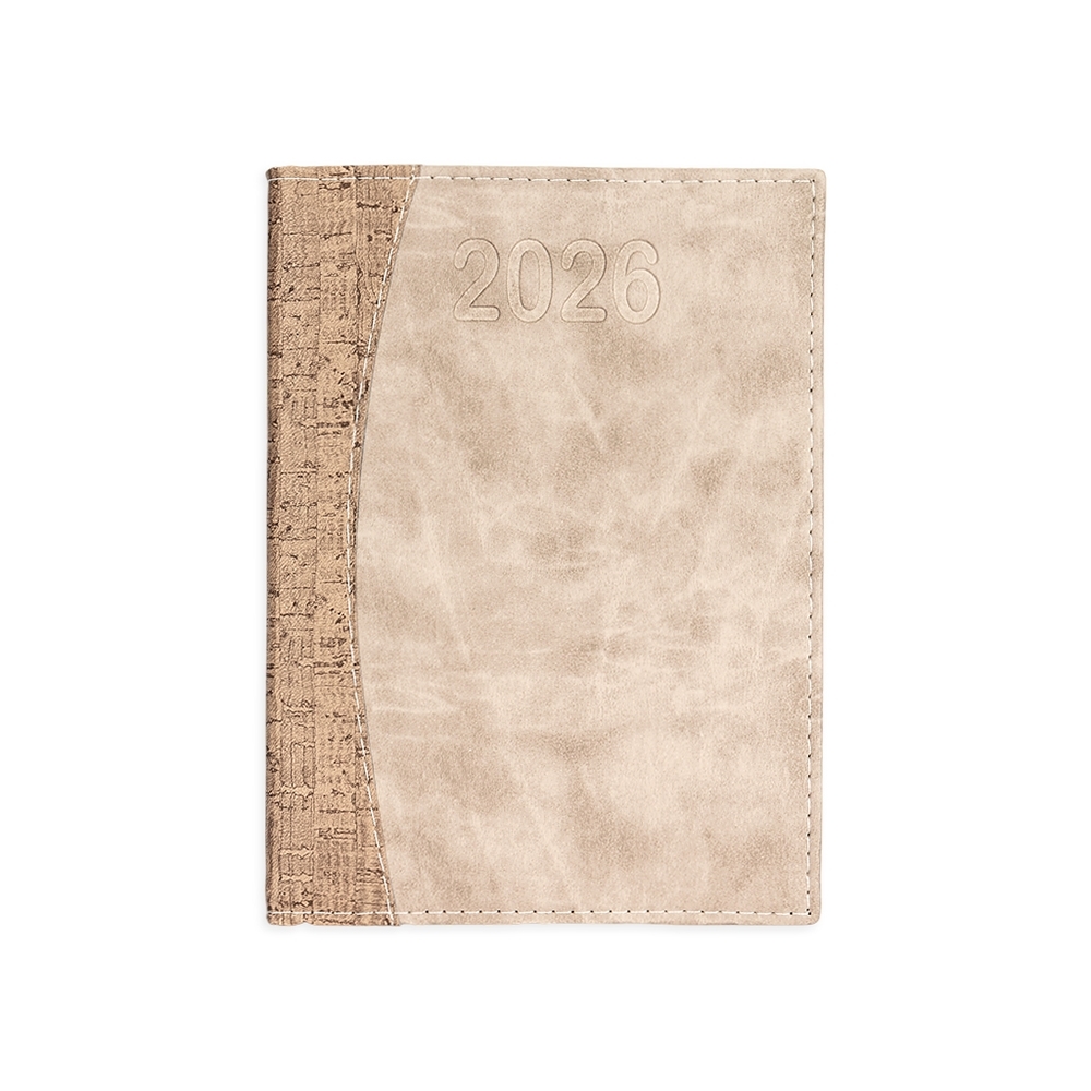 Agenda 2026 com capa em couro sintético e marcador de páginas em fita de cetim. Contém páginas dedicadas dados pessoais, calendários de 2025 até 2027, lista de contatos, planejamento diário e mapas.