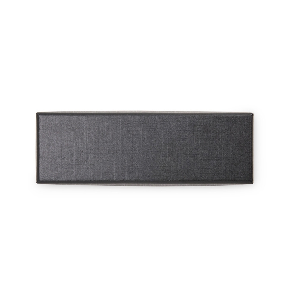 Estojo em papelão e revestimento removível de duas camadas em espuma com espaço para guardar uma caneta ou lapiseira.