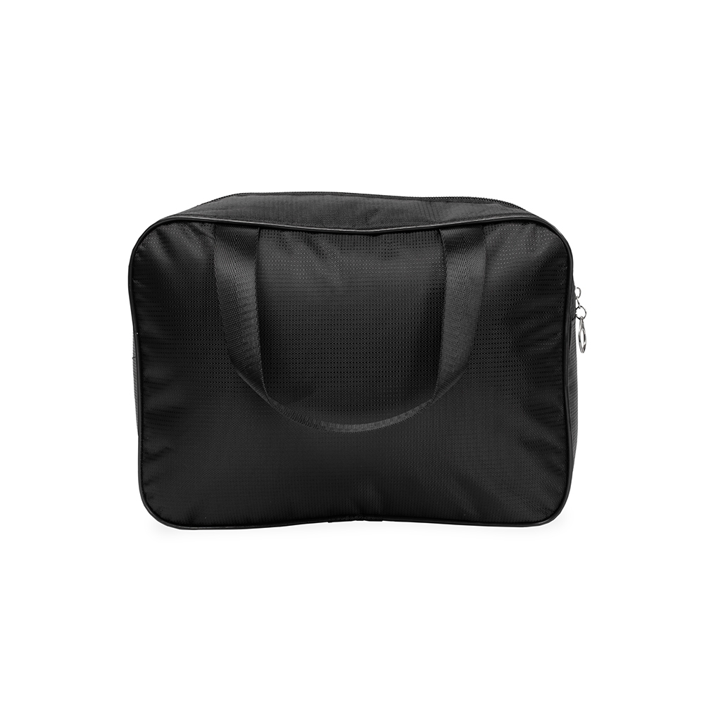 Nécessaire impermeável confeccionada em Poliéster e revestimento interno em PVC. Possui fechamento em zíper e duas alças em nylon.