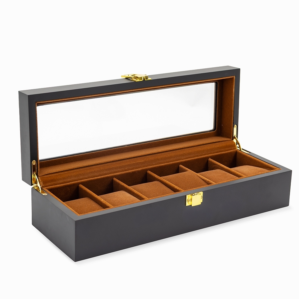 Porta-relógios feito em MDF de acabamento laqueado e revestimento interno em tecido peluciado. Possui seis divisórias com almofadas removíveis, visor em vidro e trava de segurança para fechamento da tampa.